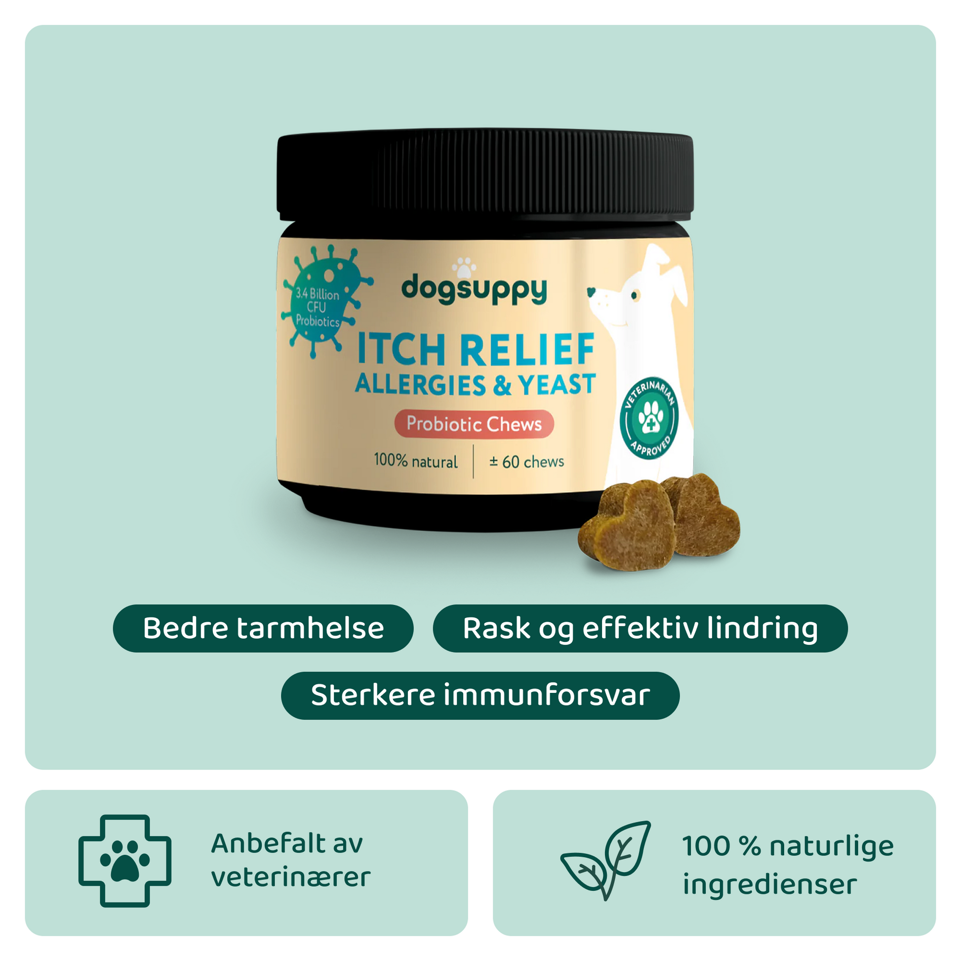 ✓ 3,4 milliarder CFU med pre og probiotika per tyggebit