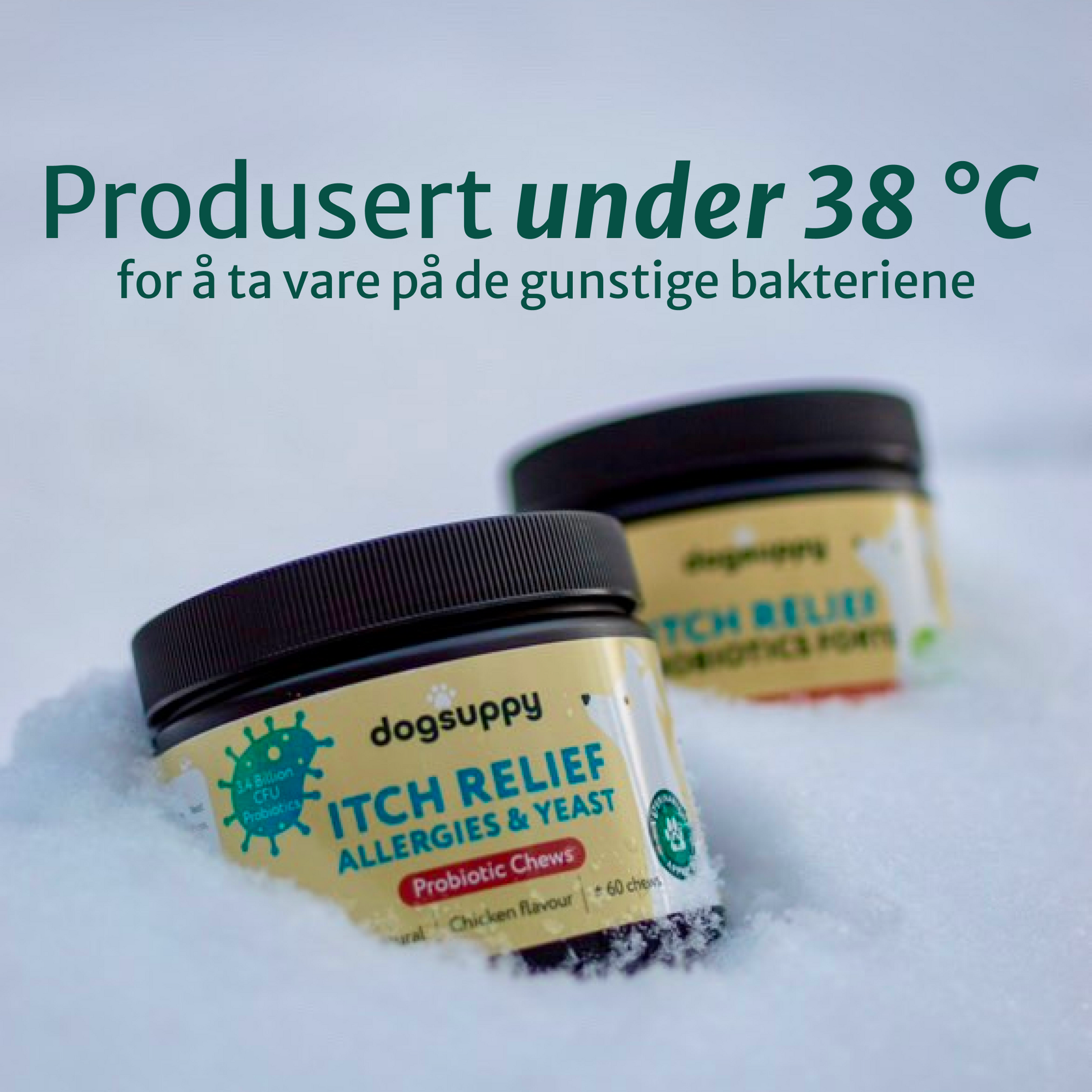 For oss er kvalitets førsteprioritet. Våre Itch Relief Probiotika-godbiter produseres i forhold under 38 °C for å bevare de gode bakteriene best mulig. Det gjør at 99 % av de gunstige bakteriene holder seg levende og fortsatt kan gjøre jobben sin.