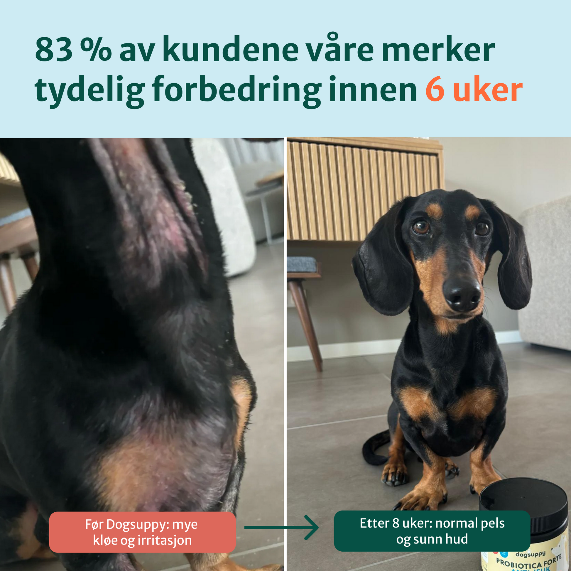 83 % av kundene våre merker forbedring innen 6 uker, men for noen kan det ta litt lengre tid, opptil 8 uker. Probiotikaen og de naturlige virkestoffene bearbeider de underliggende årsakene til problemer som kløe, slikking på potene, soppinfeksjoner og overdreven gresspising. Derfor kan det også ta litt tid før du ser effekten.