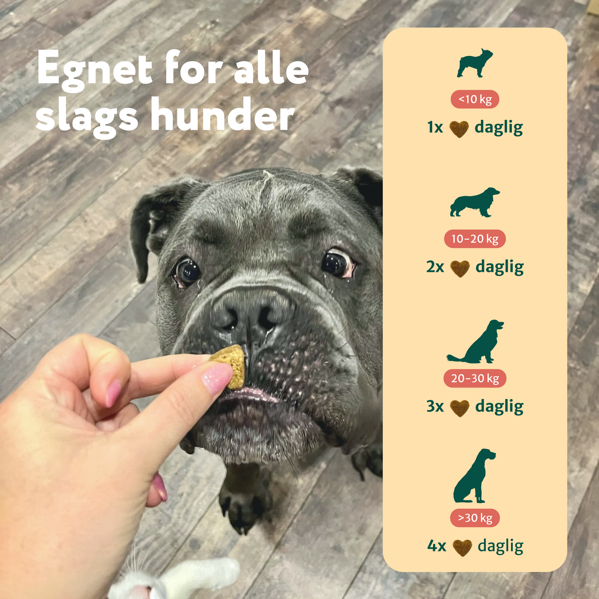 - Over 20 kg: 3 tyggebiter daglig